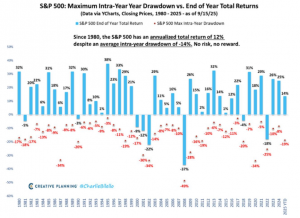 return generated by the S&P 500 each year since 1980 (blue bars) and the maximum annual decline